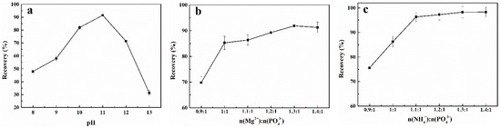 Effect of pH (a), Mg2+ concentration (b) and NH4+ concentration (c) on the recovery of phosphorus.