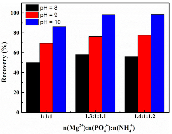 On the basis of the above research, in order to test the reliability of the best process conditions, several groups of overall tests were carried out. The results are shown in Figure 7. When the ratio of n (Mg2+:n (PO43−):n (NH4+) was increased from 1:1:1 to 1.3:1:1.1, the recovery of phosphorus clearly increased. When the ratio was increased to 1.4:1:1.2, the recovery of phosphorus was not significantly increased. pH is the main factor that restricts the recovery of phosphorus. The optimal process conditions are: pH = 10, n (NH4+):n (PO43−) = 1.1, n (Mg2+):n (PO43−) = 1.3.