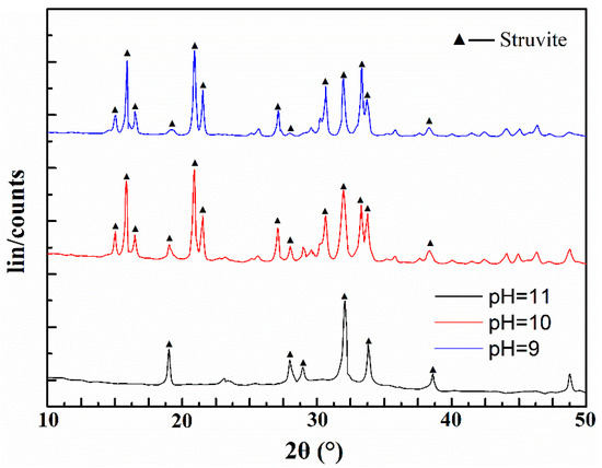 It can be seen that when the pH is 9, the peak type of the X-ray diffraction pattern of the precipitate is basically consistent with the standard pattern of MgNH4PO4·6H2O, and no other crystal image is shown, indicating that the main component of the precipitate is struvite, and the purity of the precipitate is high. However, the amount of precipitation products is very small and the phosphorus recovery rate is obviously low. When the pH is 10, the diffraction peak position is almost the same, but the intensity is obviously enhanced, indicating that most of the products are guano stone. Compared with the spectrum at pH 9, some impurity peaks are doped, which indicates that a few by-products are doped, but the amount of precipitated products is significantly higher than the product quality at pH 9, which is also consistent with the high phosphorus recovery rate of pH = 10 observed in the test process, the obvious stratification limit, and the better sedimentation performance. When the pH is 11, there is no obvious crystal characteristic peak of the precipitate, which is completely inconsistent with the diffraction peak of the MgNH4PO4·6H2O standard spectrum, indicating that the product may not be struvite.