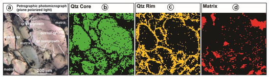 Photomicrograph of sample #1425 (a) and digitized distribution of detrital quartz (b), quartz rim (c) and matrix (d). Criteria used for the digitization are explained in the text.