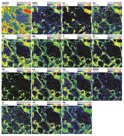 The LA-ICP-MS mapping data consist of analytical results of 9306 evenly spaced spots, which are provided in Supplementary Table S1. The maps indicate that most elements (except Si) are enriched in the matrix (and quartz rim to a lesser extent) relative to the detrital quartz core (Figure 3 and Figure 4). Elements that are strongly and distinctly enriched in the matrix include Al, K, Li, Fe, Sr, Ba, Y, Zr, Hf, La, Ce, P, U, Th and Pb (Figure 3). Elements that are moderately to weakly enriched in the matrix include Ca, Na, Mg, Mn, Ti, Ni, Cu, Zn, Eu, Dy, Lu, B and Bi (Figure 4).