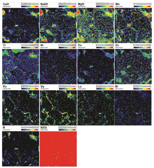 The LA-ICP-MS mapping was conducted at the Geological Survey of Canada (Ottawa, Canada) using a Photon Machines Analyte G2 193 nm laser ablation system equipped with a Helex dual-volume cell and coupled to an Agilent 7700x ICP-MS. The concentrations of trace elements are reported as part per million (ppm), and those of major elements are expressed as oxides in weight percent (wt%) converted from elemental values. The mapping work followed the methodology of Lawley [44] and is described in Chi [10]. 2D element concentration maps were prepared using a series of linescans across the sample surface, using a fluence of 8.0 J/cm2 (88.1% of 6 mJ), a spot size of 10 µm, a repetition rate of 30 Hz and a scan speed of 5 µm/s. A pre-ablation pass was completed before every analysis to clean the sample surface. The laser spot size and scan speed were optimized such that the laser would advance one equivalent spot size every 2 s. The ablation aerosol was transported out of the Helex cell using 1 L/min of helium gas and carried to the ICP-MS through 1.5 m of 2 mm (inner diameter) Teflon tubing. Prior to entering the ICP-MS, the aerosol and helium gas were mixed with ~1 L/min of argon gas. The total duty cycle time to measure all masses on the ICP-MS (in time-resolved analysis mode) was 250 ms, and utilizing a scan speed of 5 µm/s allowed for eight full scans of the mass spectrometer every 2.0 s (the equivalent of one spot diameter along the line scan). These eight scans were averaged to form one 10 µm pixel on the map.