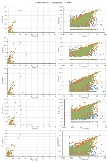Although the U and REE concentrations in the Athabasca sandstone are generally lower than average crustal abundances as well as the basement rocks [4,27,28,29], a significant number of data (~4%) in the present study, especially in the matrix and to a lesser extent in the quartz rim, yield U concentrations between 2 and 20 ppm (Figure 5 and Figure 6), which are comparable with or higher than basement rocks. These high U values show no or poor correlations with Ti, Fe and Al (Figure 6), suggesting that Ti–Fe oxides and clay minerals are not the major carriers of U. In contrast, the strong positive correlations between U and REE, Y, Th, Sr, and P suggest that monazite, apatite and/or APS might be the host minerals for both U and REE. However, the highest U data (>25 ppm U) are unrelated to any other elements and most of them are located within detrital quartz (Figure 5 and Figure 6), which may be attributed to fluid inclusions or nanoscale uraninite inclusions in the detrital quartz.