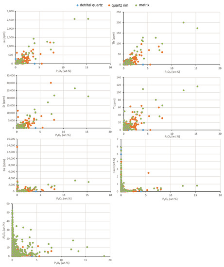 Bivariate diagrams showing various correlations between P and other elements, including positive correlations with La, Th, Sr and Y, partial positive correlations with Ba and Ca and poor correlations with Al.