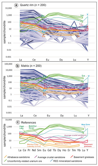 Chondrite-normalized REE patterns (chondrite values from [46]) of quartz rim (a) and matrix (b), each with 200 spots, and reference materials (c) including Athabasca sandstone [28], average crustal sandstone [47], basement gneisses [4], uraninite in unconformity-related U ores (Mercadier et al., 2011a) and REE (Y) mineralized sandstone at Maw Zone [42]. The analytical results in (a,b) are shown by the thick blue-purple lines with variable degrees of lightness to maximize the visibility of individual analyses. The REE patterns of the references are superimposed on the analytical results of this study (a,b) for direct comparison; note, however, that the REE patterns of the references (15 elements) are distorted to fit into the framework of the analyses of this study (only 6 elements).