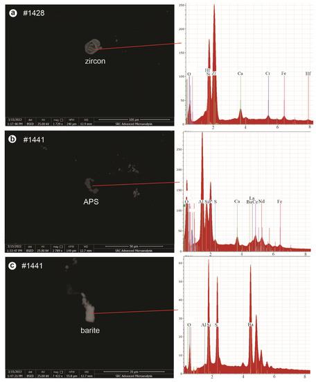 The SEM-EDS analyses indicate the presence of detrital zircon (Figure 9a) and titanium oxide, as well as diagenetic APS (Figure 9b) and barite (Figure 9c), in addition to clay minerals in the matrix.