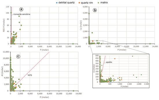 In order to evaluate potential P-bearing minerals, the concentrations of Ca, P, REE + Y and Al were converted to molar values and plotted in bivariate diagrams including Ca vs. P, REE + Y vs. P, and Al vs P (Figure 10). The main P-bearing minerals considered were apatite (Ca10(PO4)6(OH,F,Cl)2), monazite (REEPO4), xenotime (YPO4) and APS minerals (AB3(XO4)2(OH)6), where the A-site contains Na, K, Ca, Ba, Sr, Ag, Pb, U and REE, the B-site can be Al, Fe, Cu and Zn, and the X-site is either P or S. There is a positive correlation between P and REE + Y and a partial positive correlation between P and Ca, but the P/(REE + Y) and P/Ca ratios do not fit those expected for monazite–xenotime and apatite (Figure 10a,b), indicating that these minerals are not the P and REE carriers. The most likely minerals hosting P and REE are APS minerals, which were detected by SEM-EDS in this study (Figure 9b) and have been widely reported in the Athabasca sandstones in previous studies [4,7,11,15,16,28,29,31,33,41]. The poor correlation between Al and P (Figure 10c) is most likely due to the small grain sizes of the APS minerals and contamination by the clay minerals that are ubiquitously associated with the APS minerals.