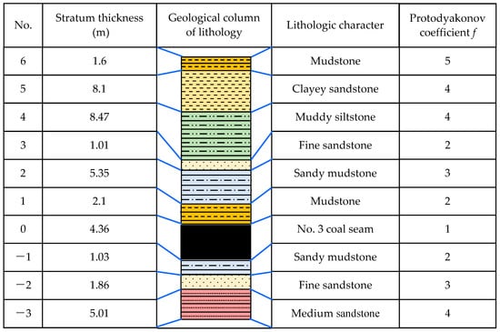 The No. 3 coal seam of the Shishan Coal Mine is supported by the occurrence stability of the coal seam; the inclination is from 3 to 5 degrees, and its overburden is composed of sandstone, mudstone, siltstone, limestone, subsandy soil, light red subclay and brecciated rock from coal seam to round surface in turn. In numerical modeling, the strata near the coal seam are mainly studied, and a comprehensive histogram of the No. 3 coal seam and rock strata is shown in Figure 1. The thickness of the coal seam is 2.6–5.2 m; the average thickness is about 4.36 m, and its protodyakonov coefficient f is about 1. There is an immediate roof of mudstone with an average thickness of about 2.1 m; the average protodyakonov coefficient f is about 2. The main roof is mostly composed of sandy mudstone and fine sandstone with an average thickness of about 5.35 m and 1.01 m, respectively. Above the main roof is mainly composed of muddy siltstone, clayey sandstone and mudstone, and their protodyakonov coefficients f are mostly distributed between 2 and 6. The lithology of the floor is mainly sandy mudstone and fine sandstone with averages of about 1.03 and 1.86 m, respectively, and their protodyakonov coefficients f are mostly distributed between 2 and 4. Further down the floor is the medium sandstone with an average of about 5.01 m.