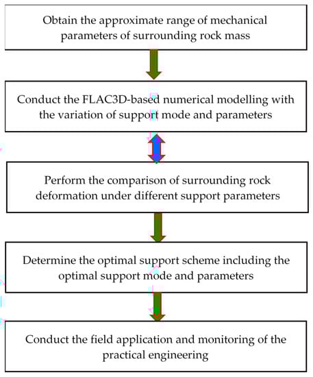For the full-space synergy control technology of the coal mine roadway, the optimization design of support parameters is the key factor in controlling the stability of the surrounding rock. The optimization methods of the supporting parameters can usually be divided into five types: engineering analogy, theoretical analysis, numerical modeling, field measurement and comprehensive design method [24,45]. This paper takes the deep mining roadway as an example to study its optimal support design, so the design of bolt parameters optimization is the key to increasing the self-bearing capacity and the stability of the surrounding rock. The bolt parameter optimization includes bolt diameter, bolt length, bolt interval and bolt pretension. Figure 3 is the process of support mode and parameter optimization in coal mine roadways using the full-space synergy control idea and method.