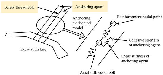 In this study, the screw thread steel bolt is chosen to install in the roadway surrounding rock. Each bolt’s structural element is defined by its geometric, material and grout properties. Generally, the full-length pretensioned anchoring of bolts is called the full-stress anchoring of bolts, rather than the term for full-length anchoring of bolts [38,46]. Pretensioned bolts can be fully anchored, and they can also be left anchored for part of their length. The entire working process of anchoring the interface of the bolts can be divided into three deformation stages, elastic deformation, strain softening and residual strength [37]. Figure 4 is the mechanical representation of the fully anchored reinforcement element system; the friction force between the bolt and the anchoring agent is expressed by the reinforcement nodal point with cohesive strength and shear strength. The large-area contact between shotcrete and the surrounding rock and bolt can penetrate into the rock mass to a certain extent so as to coordinate the deformation of the surrounding rock and act together with the surrounding rock to form the supporting arch.