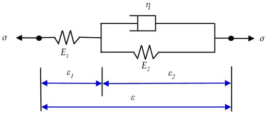 An axial force comprises axial force in the reinforcement and shear forces contributed by shear interaction along the anchoring annulus. Therefore, axial displacements are calculated by integrating the nodal accelerations using the axial force of the reinforcing element and shear forces of reinforcement. Figure 5 is a mechanical schematic diagram of an elastic-viscoelastic element for the anchored-bolt system, and it is also called the Kelvin–Voigt model [47]. In this model, the total strain ε is comprised of the instantaneous elastic strain ε1 and the Kelvin stain body ε2 as follows: