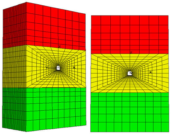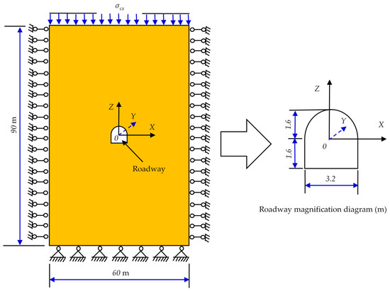 As shown in Figure 6, the coordinate origin takes the center position of the roadway, the X-axis is directed to the right, the Z-axis is directed to the upper and the Y-axis is pointing in the excavation direction. The two sides of the model are constrained in the horizontal direction, and the bottom of the model is fixed. The roadway excavation is simulated based on the actual size with a semicircular arch and a straight wall of diameter of 3.2 m and height of 1.6 m. The top surface of the calculation model employs a stress boundary condition, and the gravity stress of the overburden is used as the vertical stress applied to the top surface; the expression is as follows: