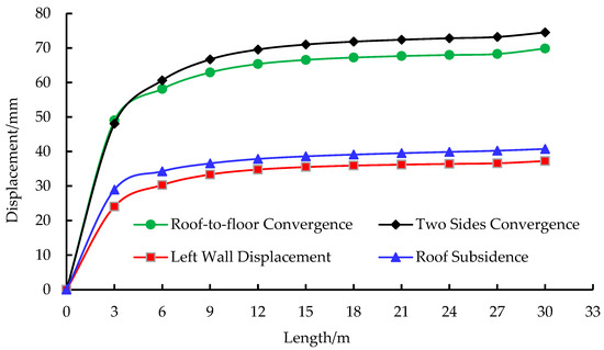 This study applies the whole section excavation of the roadway step by step, and the computation is conducted every 3 m of the excavation until the model of 30 m is fully excavated. The displacement of the roadway surrounding rock at excavation depth without support is in Table 2. Figure 8 is the deformation of the roadway surrounding rock over the excavation length in the absence of support. Although the simulation displacement results increase with the tunneling of the working face, the deformation values are very small for every 3 m excavation after the roadway is excavated 12 m. Therefore, this study takes the deformation section of the roadway after 12 m excavation as the research object in the following numerical simulation.