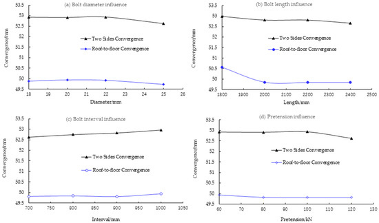 The variation curve of roadway convergence under the different influencing factors. (a) Bolt diameter influence; (b) Bolt length influence; (c) Bolt interval influence; (d) Pretension influence.