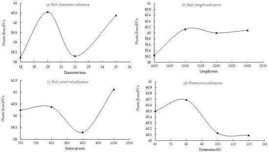 The variation of plastic zone size of surrounding rock under the different factors. (a) Bolt diameter influence; (b) Bolt length influence; (c) Bolt interval influence; (d) Pretension influence.