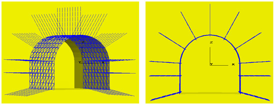 To effectively improve the stress state and control the deformation development before supporting the surrounding rock, the early strength and close bounding property of shotcrete were used to give play to the self-bearing capacity and rapidly proved to support resistance to the surrounding rock. Thus, this study applied the bolt-shotcrete combined support method with the different bolt parameters and the full-length anchorage. Figure 11 is the FLAC3D model of the bolt-shotcrete combined support. The shotcrete parameters are: Young’s modulus E = 2.5 Gpa, Poisson’s ratio v = 0.25, thickness D = 100 mm.