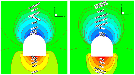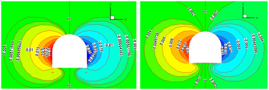 Figure 13 is the two sides displacement contour of the test roadway at an excavation depth of 12 m. From Figure 13(left), it can be seen that the maximum two sides convergence exceeds 65 mm for no supporting excavation roadway, and the convergence ratio of the two sides is 2.2% > 2%. The results show that rib spalling accidents easily occur without timely support. As shown in Figure 13(right), when the bolt-shotcrete combined support is applied, the maximum movement on both sides of the roadway can keep around 40 mm, and the convergence ratio of the two sides is 1.3% < 2%. The results show that the bolt-shotcrete support can also effectively control the movement of the two sides of the roadway.