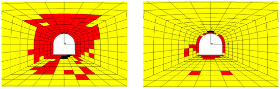 Figure 14 is the plastic elements contour of the roadway surrounding rock subjected to shear and tensile yield at an excavation depth of 12 m. As shown in Figure 14(left), the red and block elements are the plastic yield zone; these yield elements are mainly concentrated in the roof and two sides of the roadway in the absence of any support. The number of plastic yield zone elements is as high as 178; the plastic yield zone range of surrounding rock has been extended to nearly 7 m in the surrounding rock. Therefore, if the safety and long-term stability of the roadway want to be ensured, it will be necessary to carry out the roadway support in a timely manner. As shown in Figure 14(right), while the combined support pattern of bolt-shotcrete is adopted, the plastic yield zone at the roof and the corner or two sides of the roadway is well controlled; this also means that the stress concentration problems of the roadway surrounding rock are addressed. The plastic yield zone range is obviously reduced and is less than 1 m. Thus, the optimization of the support pattern is also very important to control the plastic yield zone development of the roadway surrounding rock.