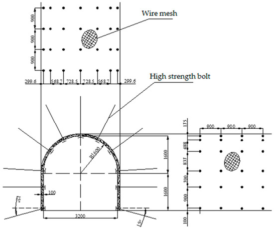 According to the above analysis of the convergence and plastic yield zone of the roof, floor and two sides of the roadway surrounding rock, the bolt-shotcrete combined support can effectively weaken the stress concentration at the corner of the roadway, and improve the self-bearing capacity of the surrounding rock at the corner and two sides of the roadway, so as to reduce the deformation of the roadway’s two sides. The roof separation and subsidence caused by the failure of the surrounding rock can be effectively controlled by strengthening the roof, corners and two sides of the roadway. The deformation and plastic yield zone development of the surrounding rock are kept under the required range after performing bolt-shotcrete support, which illustrates that the selected support pattern and parameters can improve the stress environment and hold the further expansion of the loose zone of the surrounding rock, and ensure the stability and safety of the roadway surrounding rock. In order to take full advantage of these advantages of active support and full-space synergistic control idea and method, a W-shaped steel strip and wire mesh are used as supplemental support, the net type is a metal diamond mesh with a mesh of 100 mm × 100 mm, and the overlap length of the nets is 100 mm. The row and line spacing are mainly between 700 and 900 mm, and it can keep changing based on the practical design section size; the screw thread steel bolts are perpendicular to the surrounding face, and the bolts near the wall shall be tilted to a 15°angle with respect to the walls. The bolt-shotcrete net beam support structure of the test roadway is proposed in this study for the stability control of the roadway surrounding rock in the Shishan Coal Mine, which is shown in Figure 15.