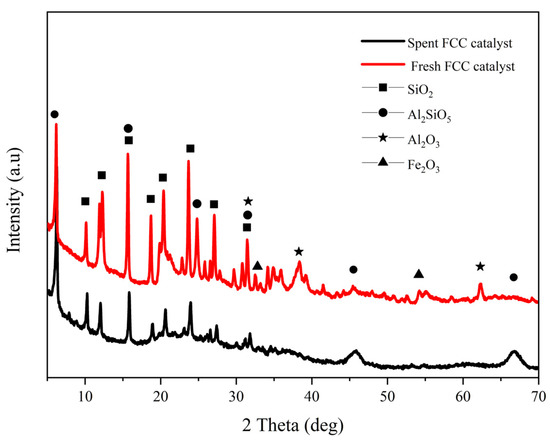 Figure 2 shows the XRD patterns of the fresh and SFCC catalysts from a petroleum refinery in Hubei, China. The XRD patterns of the fresh and SFCC catalysts were analyzed to observe the phase transition of the FCC catalyst matrix. According to the patterns, the main crystal phase of fresh catalyst is zeolite. Some typical zeolite-Y peaks have much weaker reflections for the peaks at 6.3°, 10.3°, 12.1°, 15.9°, and 23.9°. This is consistent with the standard zeolite-Y phase (HighScore Plus card number, 01-073-2313). The hkl (111), (220), (311), (331), and (533) Miller indices indicate that the framework of the zeolite crystal was severely damaged. With a decrease in the size of the cell and with an increase in the Si/Al ratio, the peak positions in the XRD pattern shift slightly to a higher angle. However, no peaks of the V, Ni, and Fe compounds were observed in the XRD patterns. As seen in Figure 1, the contents of V, Ni, and Fe in the SFCC catalyst are below the detection limit of XRD. However, the effects of the V deposition on FCC catalysts are widely known [14], including a reduction in the surface area, destruction of the zeolite crystal structure, and extraction of the aluminum framework, causing decreased activity. A decrease in the surface area of the catalyst with an increase in the vanadium content means that the active sites available for catalytic reaction decrease and the catalyst activity decreases. The specific surface areas of the fresh catalyst and the SFCC catalyst were 58.91 and 34.86 m2/g, respectively, and this reveals that the spent catalyst sample was deactivated.