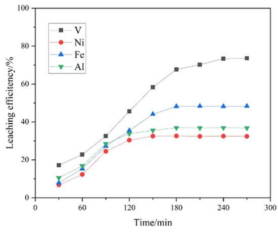 The effects of the leaching time on the extraction of SFCC catalysts are shown in Figure 5. As seen in Figure 5, the leaching efficiency of Ni and Al increased rapidly during the first 120 min and increased slowly after that. However, the leaching efficiency of Fe increased dramatically during the first 180 min and achieved equilibrium when the leaching time was extended to 240 min. In addition, there was a sharp increase in the leaching efficiency of V when the leaching time extended from 0.5 to 240 min, however, there was no significant increase in the leaching efficiency, and remained virtually unchanged. This case may be mainly ascribed to the existence of metals that were difficult to be dissolved in the oxalic acid solution. Since oxalic acid is a weak acid, the conversion of metal oxide into complexes has a complex and time-dependent character. To ensure that the equilibrium was reached for each test, the optimum leaching time of 240 min was used in the subsequent leaching experiments.