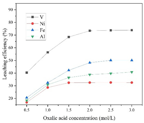 The relationship between the oxalic acid concentration and the leaching efficiency of SFCC catalysts is shown in Figure 6. The leaching efficiency of V was as high as 43.1% when the oxalic acid concentration was at a low level of 0.5 mol/L, and the leaching efficiencies of Fe, Al, and Ni were 21.5%, 18.3%, 12.5%, respectively. The pH of the leachate was 1.32, and the major form of the oxalic acid species was HC2O4− and H2C2O4 [22]. The results show that V leaching is more likely to occur than that of the metal oxide under low acidic conditions. When the oxalic acid concentration was increased from 0.5 to 2 mol/L, the pH decreased from 1.32 to 0.31, and the main substance changed to H2C2O4. It can be clearly seen that the leaching efficiency of metal oxide increased with the increasing H2C2O4 concentration and eventually stabilized, even when the H2C2O4 concentration was further increased after reaching 2 mol/L. The reason for this is that oxalic acid is a weak acid, and the concentration of oxalate is directly proportional to the concentration of oxalic acid. Therefore, the effect of the complex formation becomes obvious at high acid concentrations. However, when the concentration was higher than 2.0 mol/L, the leaching rate did not increase with an increase in oxalic acid, and the increase in the leaching rate could be ignored. A concentration of 2.0 mol/L oxalic acid was the optimum condition to obtain relatively high metal oxide leaching efficiencies.