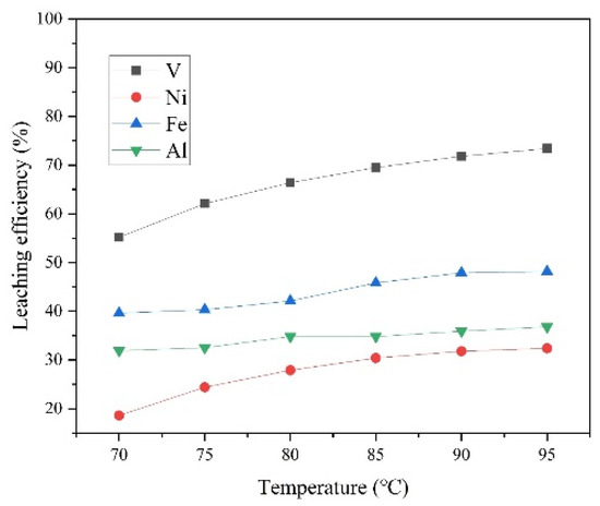 Figure 7 presents the results of experimental studies designed to determine the leaching efficiencies of compounds from the spent catalyst at different leaching temperatures. It can be seen in Figure 7 that the leaching efficiencies of V and Ni increased with an increase in the leaching temperature. The highest leaching recoveries of V (73.4%) and Ni (32.4%) were achieved at a temperature of 95 °C, and this confirmed the endothermic nature of the reaction. As seen, the temperature had very little impact on the leaching efficiencies of Fe and Al in the range of 70–95 °C. This finding indicates that great changes in temperature affect the reaction equilibrium of leaching V and Ni via the oxalic acid from SFCC catalysts; whether the dissolution rate of the metal is faster or slower in the initial stage indicates that the mass transfer through the product layer is important for leaching kinetics. However, this illustrates that this phenomenon requires more investigation in the field of kinetics for the leaching process, and will be the topic of our next research manuscript. In addition, oxalic acid easily volatilized and thermally decomposed when the solution temperature was higher than 95 °C [9,20]. Therefore, the optimized leaching temperature was regarded to be 95 °C.