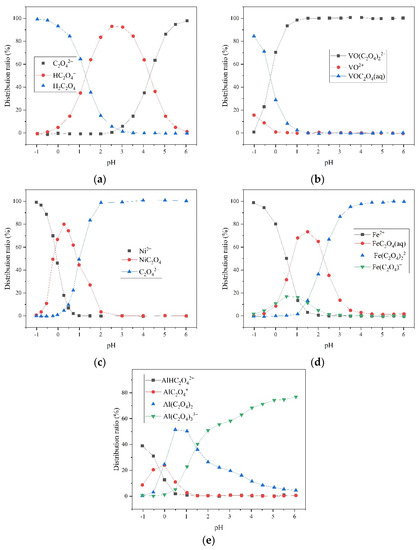 Oxalic acid is one of the most widely used organic acids in the extraction of metals from SFCC catalysts because of its high acid strength and complexing ability. The oxalate concentration was measured following the standard method (ISO 6353-1-1982) [23]. The occurrence states of pure oxalic acid, vanadium, and nickel in the oxalic acid leaching solution are shown in Figure 8. As seen in Figure 8a, pure oxalic acid mainly exists in three forms: H2C2O4, HC2O4−, and C2O42−. Under strongly acidic conditions, oxalic acid is dominated by the H2C2O4 molecules supplemented by HC2O4− ions. However, oxalic acid forms different soluble complexes depending on the type of metal [1]. Whether or not oxalic acid compounds are soluble in water depends on the interaction between the metal and the ligand, and all oxalate complexes are water-soluble.
