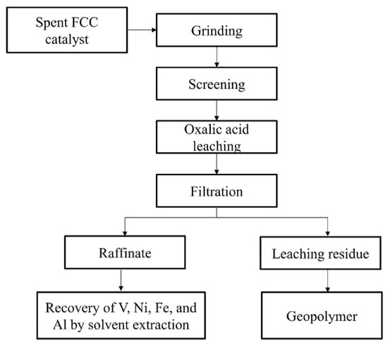 In view of the worldwide depletion of natural resources and ongoing environmental pollution, increased recycling is necessary, specifically for the recycling of semi-manufactured products, secondary materials, by-products, and wastes, including detrimental wastes [1,2,3]. Most industrial wastes are now regarded as recyclable substances and valuable sources of raw materials. A typical fluid catalytic cracking (FCC) catalyst consists of a mixture of an inert matrix (kaolin), an active matrix (alumina), a binder (silica or silica-alumina), and a rare earth-exchanged Y-zeolite. The FCC catalysts that are generally used are high-silica faujasites with X-type, Y-type, and ZSM-5 zeolites [4]. In the FCC process, a large part of the feedstock is converted into coke, and a small amount of alumina (Al), iron (Fe), vanadium (V), nickel (Ni), etc., impurities in crude oil will gradually deposit on the catalysts [1]. In terms of metal poisoning, V and Ni are the main poisons. V is the most dangerous because it destroys the structure of the zeolite and catalyzes dehydrogenation reactions [5]. The cumulative amount of spent fluid catalytic cracking (SFCC) catalysts in the world is approximately 840,000 tons [6]. SFCCs are managed through the following approaches: (1) chemical or microbial treatment for the recovery of valuable metals for different applications, (2) regeneration and reuse and (3) landfilling [7]. Dealing with deactivated industrial catalysts has become a serious problem and has not been fully solved yet.