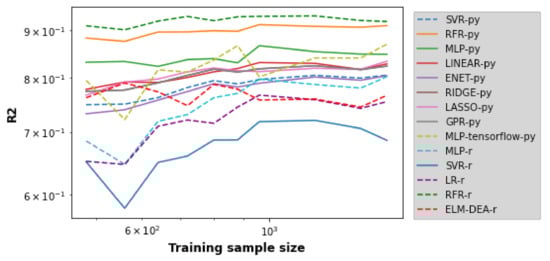 Figure 7 shows the results obtained during the SML tool training and testing using 80 and 20% of the dataset, respectively. This figure does not show RFR-r because its performance was very poor; its inclusion was detrimental to achieving a good resolution of the performance of the rest of the SML tools. Again, the SML tool multiparameters were tuned via trial and error. In general, Figure 7 reveals that as the dataset increased from 600 to 2000, R2 increased for both the SML tool training and testing. This increase in samples benefited the capture of the cell bank’s behavior regarding uncertainty space, and in turn, the SML tools’ performance. This figure shows that SVR-py, MLP-skl, LR-skl, ENR-py, RR-py, LAR-py, GPR-py, MLP-TensorFlow-py, MLP-r, and ELM-DEA-r provided an R2 close to 0.8 when the simulation sample was equal to 2000; then, they went to the next stage. In Step 4, the GSA was carried out using the Sobol–Jansen method and SMs, and the results are shown in Figure 8 and Figure 9.