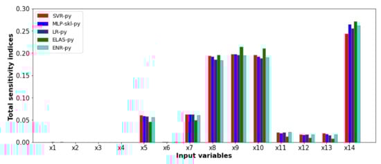 Figure 4 shows the total sensitivity indices provided by the Sobol–Jansen method for the surrogate and grinding models when the output variable was the power consumption. Here, we can see that the total sensitivity indices obtained from SM were similar to those obtained with the grinding model, highlighting the indices reached with the ELM-DEA surrogate model, which required more training time (approximately 600 s) owing to the stochastic nature of DEA. The GSA indicated that the influential input variables on power consumption were and . The equation used to estimate the power consumption included the first two input variables, explaining their high total Sobol index [43]. influenced the ratio between the ore mass and water mass retained inside the mill, and therefore, the power consumption. influenced the specific breakage rate, and consequently, the mass retained in the mill. The latter influenced a fraction of mill filling, and in turn, the power consumption (see [9,43]). Figure 5 shows the total sensitivity indices provided by the Sobol–Jansen method for the SMs when the output variable was the comminution-specific energy. The latter was influenced mainly by , , , and . By definition, directly affects the comminution-specific energy, explaining this input variable’s high total Sobol index. and , and , directly and indirectly, affected the power consumption, respectively, and therefore the comminution-specific energy [9,38,43]. An immediate result of the GSA was reducing the uncertainty space to (, , , ,, , , and (, , , ,, , , for the power consumption and comminution-specific energy, respectively. Therefore, optimizing the SAG mill’s outcomes must be made over the reduced spaces to achieve effective operational conditions and decrease the computational burden. Such optimization can be addressed via metaheuristic algorithms [44]. Table 3 shows the execution time required to obtain total sensitivity indices by each tool, revealing significant computational gains by applying the proposed methodology. Note that the execution time was more significant for Python than R, indicating that the programming of the Sobol–Jansen method in Python must be improved.
