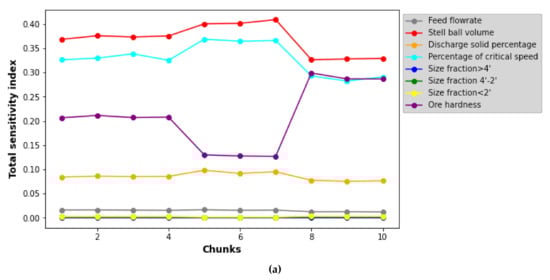 Table 6 shows that R2 for training and testing was greater than 0.8 in both power consumption and specific comminution energy and for all chunks including the batch ELM (first chunk). This procedure was repeated, considering the arrival of 10 sets 20-by-20. Again, good results were obtained from the point of view of the solution quality and execution time (approximately 0.1 s for each chunk). Each SM developed was immediately subjected to GSA via the Sobol–Jansen method using different magnitudes for uncertainties, as shown in Figure 10.