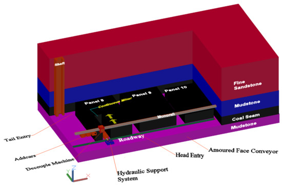 The excavation parameters of the automated CMCB are used in numerical simulation to determine the most effective sequence of coal excavation in a typical mine. While our research team has proposed this mining method in an earlier publication [27], this paper further enumerates the equipment requirements, modifications and positioning, ground stress and mine layout. The mining equipment and mine layout were drawn using Creo Parametric and AutoCAD. Geological data of a typical underground mine in the western part of China published by Zhang, et al. [28] were used for the FLAC3D numerical simulation. The induced ground stresses and vertical displacements of the mined area were investigated in five different sequences of mineral excavations.