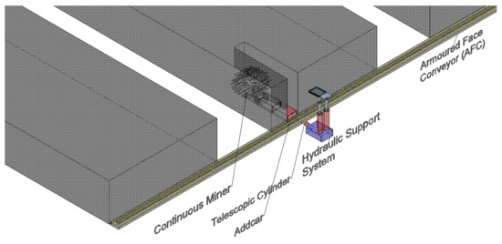 As shown in Figure 1, the continuous miner with a 4 m width cutting drum makes the first cut into the coal slice along the x-axis; as the continuous miner advances in the y-direction, successive addcars are attached to it with the aid of the coupling-decoupling machine. The telescopic cylinder of the hydraulic support system pushes the addcar; thus, the addcars act as a drill rod for the continuous miner and as a conduit to convey coal back out to the armored face conveyor. This operation continues until the complete coal slice (200 m length) is mined out, and then the mining equipment is removed and moved to the next coal slice. A monorail is installed on the mine roof, and it connects the addcars stack (i.e., storage for 50–60 addcars) to the coal workface. In addition, the couple-decouple machine is mounted on the monorail in front of the hydraulic support system.