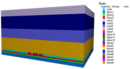 The FLAC3D is a three-dimensional finite-difference program developed by the Itasca company. It is one of the most widely used numerical simulation software in geotechnical engineering, such as underground mining [35]. FLAC3D simulation of the coal mine was created as shown in Figure 6 below, with an overburden rock profile of 130 m depth, coal seam of 5 m thickness, floor of 15 m thickness, and reserve width of 248 m. While the required workface width is 48 m, the 248 m width was modelled with 100 m wide coal pillars at both sides of the workface to avoid the effects of artificial boundaries. The dimension of the simulated coal panel is 200 m × 48 m × 5 m in length, width and height, respectively. No in situ stress was considered, and the gravity was set to −10 m/s2. There were 163,680 zones and 174,250 grid points in the numerical model. The simulated coal panel below shows roof 4, roof 3, roof 2 and roof 1, denoting aeolian sand, loess, gelling agent; medium sandstone; fine sandstone and mudstone, respectively. In addition, floor 1, floor 2 and floor 3 denote siltstone, fine sandstone and mudstone, respectively, with the coal seam between the roof and floor layers. Lastly, the coal seam is divided into 12 slices, denoted by slice1 to slice12. The physical and mechanical properties of individual rock lithology shown in Table 3 were assigned, and the Mohr–Coulomb mechanical model was applied to the simulation.