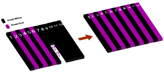 This is shown across the simulations in Figure 8 below at the bottom center, i.e., the 48 m width workface. The direct order sequence mining requires the incorporation of a web pillar to act as a support and retaining wall for the backfill mixture, which will reduce the available time for coal extraction due to the required waiting time for the setting of backfill slurry. The EOS and OES models show that the first six coal slices (2₋4₋6₋8₋10₋12) and (1₋3₋5₋7₋9₋11), respectively, can be excavated with appropriate stress redistributions on the surrounding temporary pillars without the requirement of web pillars and waiting time. The DGS model shows that during the first six slice (1₋4₋7₋10₋2₋12) excavations, coal slice 2 will be excavated next to a backfilled stope, the same as coal slice 5 in the second (3₋6₋9₋5₋8₋11) excavation cycles.