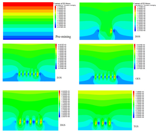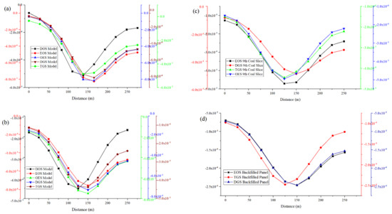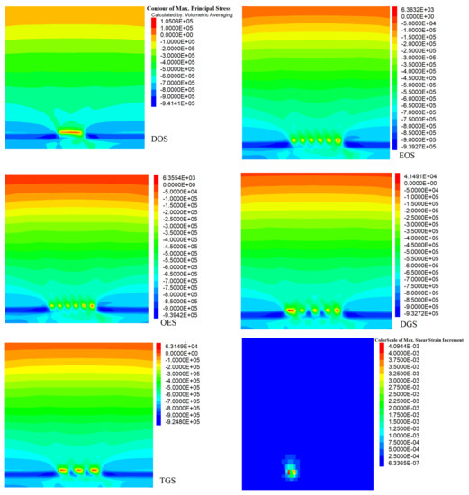 As shown in Figure 9, the maximum principal stresses in the models occur on the ground surfaces and the immediate roofs. Immediate roofs of the DOS and OES models show the highest and lowest levels of maximum principal stresses, respectively. In addition, the shear strain contour shows that when excavating the coal slices from left to right, the preceding coal pillar or backfill will experience the highest amount of shear deformation.