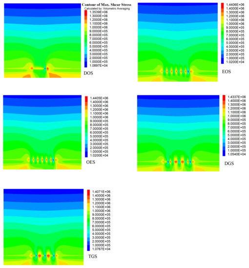 The zones of maximum shear stresses occur at the backfilled stopes (Figure 10). The EOS and OES undergo the highest shear deformation at 1.4 × 106.