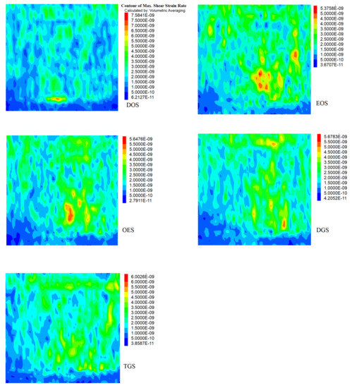 The zones of shear strain in the overburden show that the D0S (7.0 × 10−9) and the TGS (5.0 × 10−9) experience the highest and lowest shear strain, respectively (Figure 11).