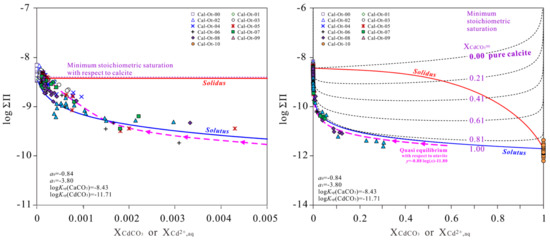 3.4.2. Lippmann Diagram for the Non-Ideal (Ca1−xCdx)CO3 Solid Solutions