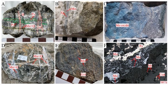 Photographs of ore petrography of the Shangfanggou Mo–Fe deposit: (A) quartz–molybdenite veinlet and pyrite veinlets crosscut by the late quartz veinlet; (B) banded structure; (C) membranous structure of the Mo oxide ore; (D) stockwork structure showing multistage mineralization; (E) disseminated Mo mineralization in the garnet-skarns; (F) the curved lepidosome molybdenite and paragenetic pyrite, magnetite, and chalcopyrite unevenly distributed between gangue minerals. Abbreviations: Q, quartz; Mo, molybdenite; Py, pyrite; Grt, garnet; Mt, magnetite; Ccp, chalcopyrite.