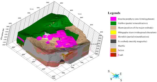 Three-dimensional (3D) geological modeling is a prominent technology that can be used to calculate or extract key parameters from 3D information on ore deposits [1]. Applying the theory of a metallogenic system, combined with multi-parameter or multi-source (geological, geophysical, geochemical, and hyperspectral) and multi-method modeling and analysis of a 3D ore-forming geologic body, the capabilities of quantitative and big data collation, mineral exploration, and mining are greatly improved [2,3]. It has been proved that 3D GIS or modeling packages (e.g., Micromine, GOCAD, and Surpac) are excellent means of data representation and interpretation [4].