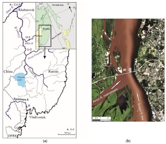 The Russian Far East is a vast region stretching for more than 4000 km from the border with Korea in the south to the Chukchi Peninsula in the north. High-latitude boreal and subarctic climatic conditions with annual precipitation below 600 mm are typical for the region’s north part. Small- and medium-sized rivers are typical there. The temperate, boreal area that is a subject of study in this paper covers the south part of the Kamchatka peninsula, Sakhalin Is., Khabarovsk, and Primorye regions with more abundant annual precipitation up to 1000 mm and more copious river runoff. Besides small- and medium-sized rivers, this temperate, boreal area is drained by the huge Amur R. with a watershed of 1856 × 103 km2 (8th world rank) and an annual runoff of 344 km3 (14th world rank) [22].