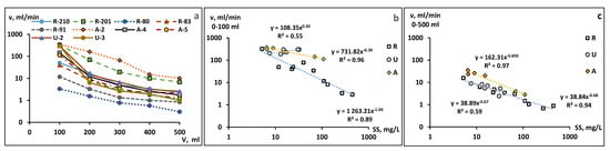 Figure 2. (a) Dynamic of the filtration rate (ml/min) decrease at the successive filtration of river water samples. (b) Dependence of the filtration rate on the first 100 mL of water with different concentrations of suspended solids SS (mg/L). (c) Dependence of the filtration rate on 500 mL water samples. R, U, A, Razdolnaya R., Ussuri R., and Amur R., respectively.