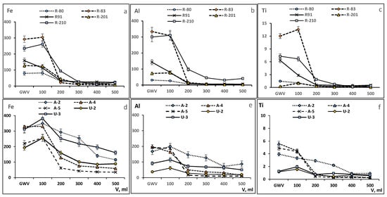 The first group includes Fe, Al, Ti, Pb. The concentration of these elements in filtrates showed the most significant decline with filtration volume growth, especially at the first increment from 100 to 200 mL. The rate of concentration decreases the slowdown in the following portions of the filtrate (Figure 3 for Fe, Al, Ti, and Table S1 for Pb). The initial concentration of the forms of these elements responding to the clogging seems to be a major reason controlling their behavior during filtration. The similar initial concentrations were accompanied by the analogous dynamic of concentration decrease in filterable forms (e.g., A-2 and U-3 for Fe, R-201 and R-91 for Al, Figure 3) even at the quite different suspended solid content and clogging rate (Figure 2). The reduction of filterable Fe, Al, and Ti due to clogging in the Razdolnaya R. water was more pronounced compared with Amur R. and Ussuri R. waters (Figure 3a–c vs. Figure 3d–f), especially at the level of suspended solids less than 50 mg/L. The difference between filtrates after capsule filters and first 100 mL subsamples was within the 10–15% of concentrations observed or showing some decrease in distinct clogging (e.g., R-91 at Figure 3a–c).