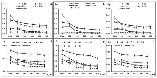 Figure 4. The concentrations of Y (a,d), Ce (b,e), and Dy (c,f) (µg/L) in filtrates obtained at the capsules (GWV) after 500 mL and Millipore membranes after filtration of 100, 200, 300, 400, 500 mL for waters from Razdolnaya R. (upper panel) and Amur R./Ussuri R. (lower panel).