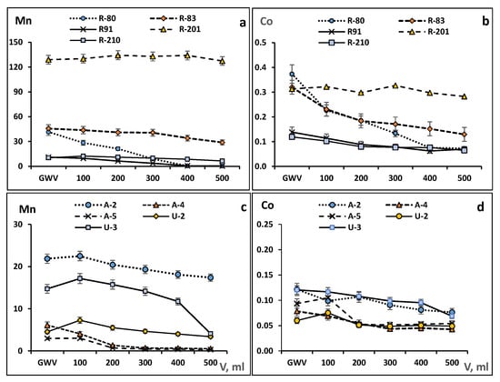 Figure 5. The concentration of Mn (a,c) and Co (b,d) (µg/L) in filtrates obtained in the capsules (GWV) after 500 mL and Millipore membranes after filtration of 100, 200, 300, 400, and 500 mL for Razdolnaya R. (upper panel) and Amur R./Ussuri R. (lower panel).