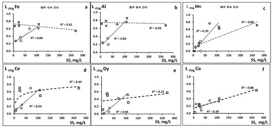 Figure 6. Share of losses (Lclog) of filterable forms of metals due to clogging during filtration of 0.5 L of Razdolnaya R. (□), Amur R. (◊), Ussuri R. (o) at the different contents of suspended solids (SS) for the elements: (a) Fe; (b) Al; (c) Mn; (d) Ce; (e) Dy; (f) Co.