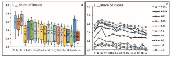 Figure 7. (a) Whisker-box plot (max, min, quartiles, med, mean) of the share of losses for the metals susceptible to clogging. (b) Decline in the share of losses of REEs for the rivers studied.
