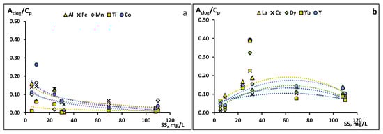 Figure 8. (a) Share of clogging in the concentration of particulate forms of elements at the different suspended solids content in river waters for the Fe, Al, Ti, Mn, Co; (b) the same for the Y and REEs.